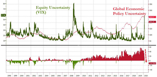 有人提到,当前股票市场的不确定性已经赶上全球经济政策的不确定性了。(下图绿线代表股市不确定性,红线代表全球经济政策不确定性)